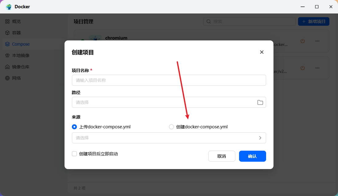 2、来源选择:创建docker-compose.yml,并粘贴以下代码